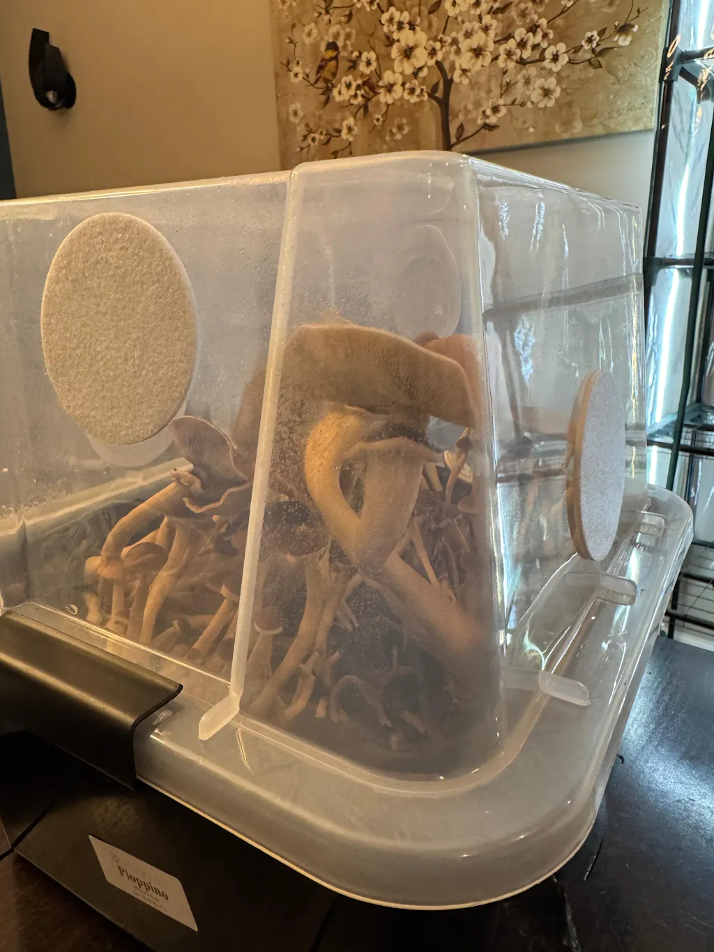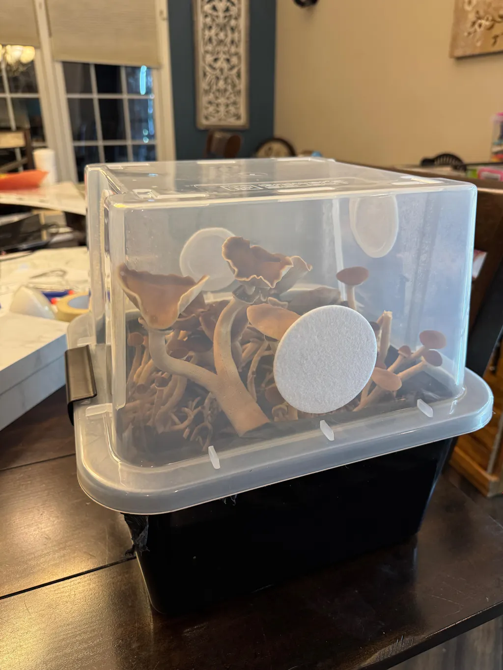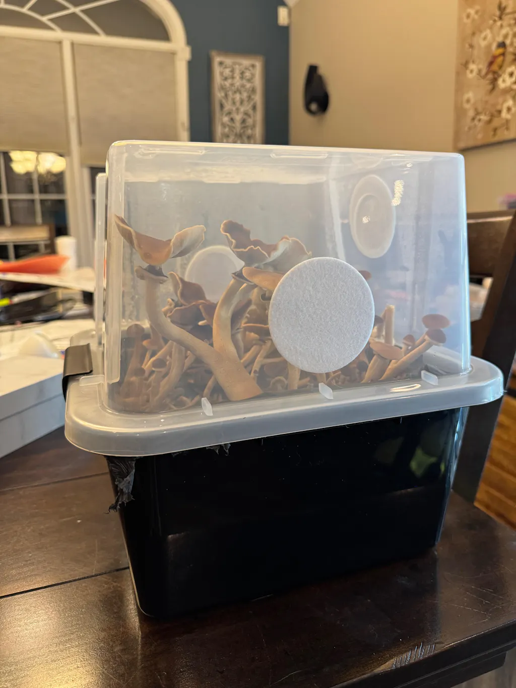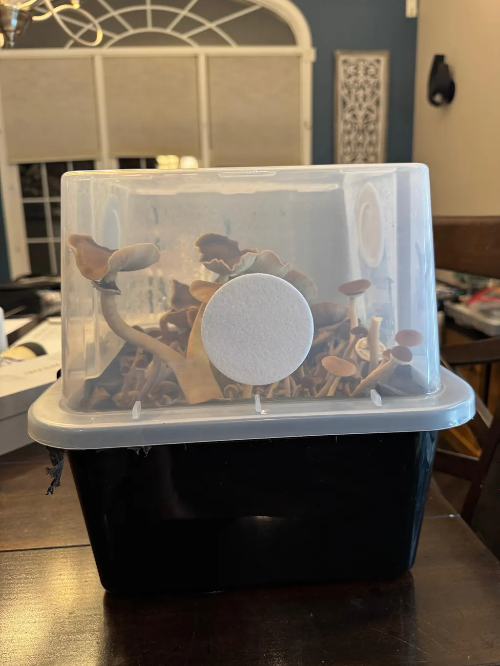 Below is an example of a successful fruiting run using the Small 28Q Monotub Grow Kit, demonstrating healthy mushroom development in a compact bulk-growing setup.